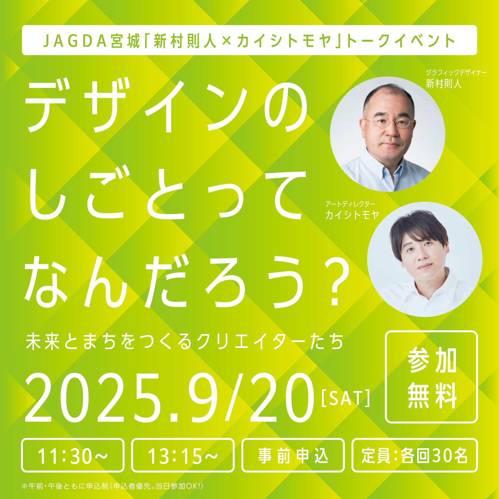 第2回となる今回は、「デザインのしごとってなんだろう?」をテーマに、第一線で活躍するグラフィックデザイナー 新村則人さんと、アートディレクター カイシトモヤさんを仙台にお迎えし、クロストークを中心にプログラムを展開します。災害や環境問題、そして日々の暮らしの中に息づく“デザイン”を手がかりに、今の時代に求められるクリエイティブのあり方を、会場の皆さんと一緒に考える一日にしたいと思っています。
